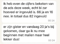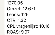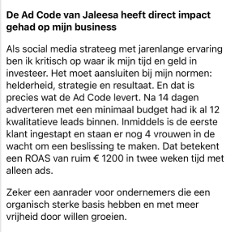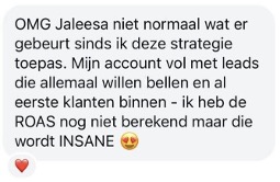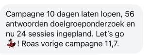 Als social media strateeg met jarenlange ervaring ben ik kritisch op waar ik mijn tijd en geld in investeer. Na 14 dagen adverteren met een minimaal budget had ik al 12 kwalitatieve leads binnen. Inmiddels is de eerste klant ingestapt en staan er nog 4 vrouwen in de wacht om een beslissing te maken. Dat betekent een ROAS van 16 met een opbrengst van ruim € 1200 in twee weken tijd met alleen ads. Zeker een aanrader voor ondernemers die een organisch sterke basis hebben en met meer vrijheid door willen groeien.