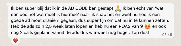 Ik ben zooo blij dat ik heb meegedaan met de AD Code. Adverteren stond al een tijdje op mijn lijstje, maar het leek me zo ingewikkeld. Ik vond de mix van live Q&A sessies + online leeromgevingen met duidelijke instructies en tutorial video's echt heel fijn. Jullie hebben het echt heel eenvoudig gemaakt en jullie enthousiasme en expertise was voelbaar. Ik ben zo blij dat ik het eindelijk begrijp en goed kan toepassen. Het programma zorgde bij mij ook voor een stok achter de deur, wat heel helpend was. Dankjewel lieve Jaleesa & Diede, ik kijk er heel erg naar uit hier mee aan de slag te gaan!